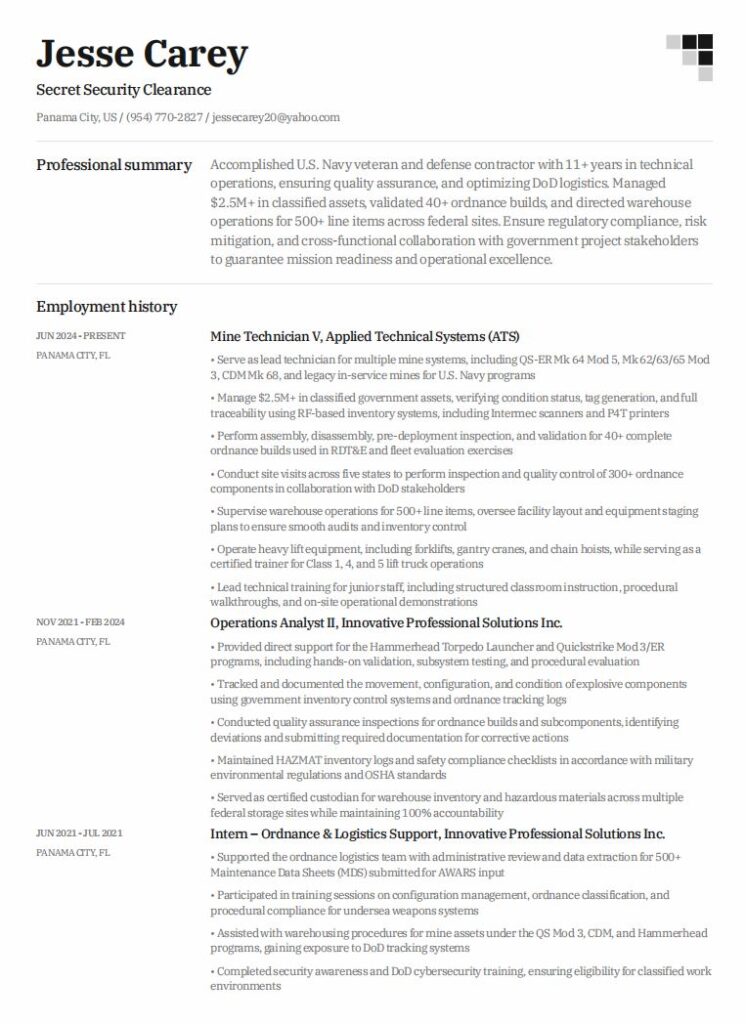 Since transitioning into the civilian workforce, I’ve supported major U.S. Navy underwater mine programs, including Quick Strike and Hammerhead. I specialize in assembling, testing, and maintaining ordnance systems, while also managing sensitive government inventory to exacting standards and maintaining quality control. As a certified Warehouse and Hazmat Custodian, I consistently ensure compliance, accuracy, and seamless operations.”